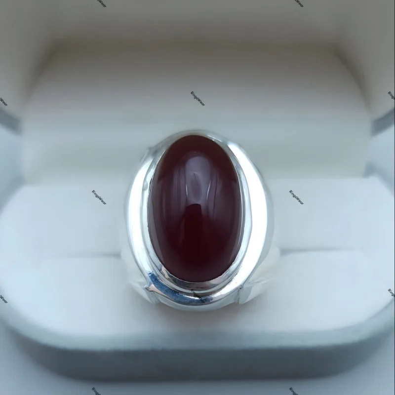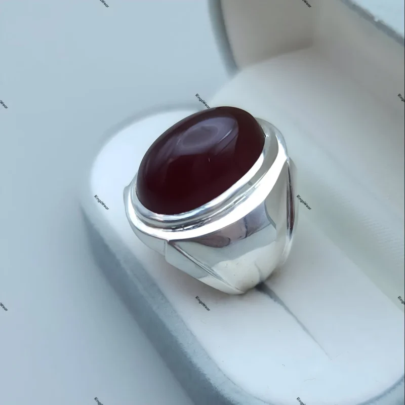 This exquisite piece features a genuine Yemeni Aqeeq stone, renowned for its rich color and cultural significance. The smooth sterling silver band complements the stone beautifully, creating a ring of undeniable sophistication.
