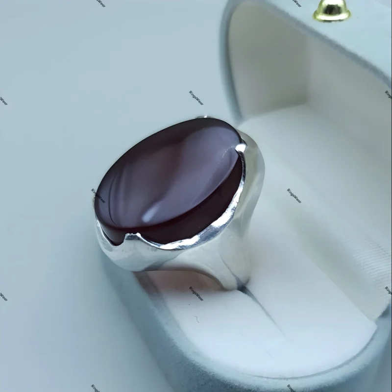 This exquisite piece features a genuine Yemeni Aqeeq stone, renowned for its rich color and cultural significance. The smooth sterling silver band complements the stone beautifully, creating a ring of undeniable sophistication.