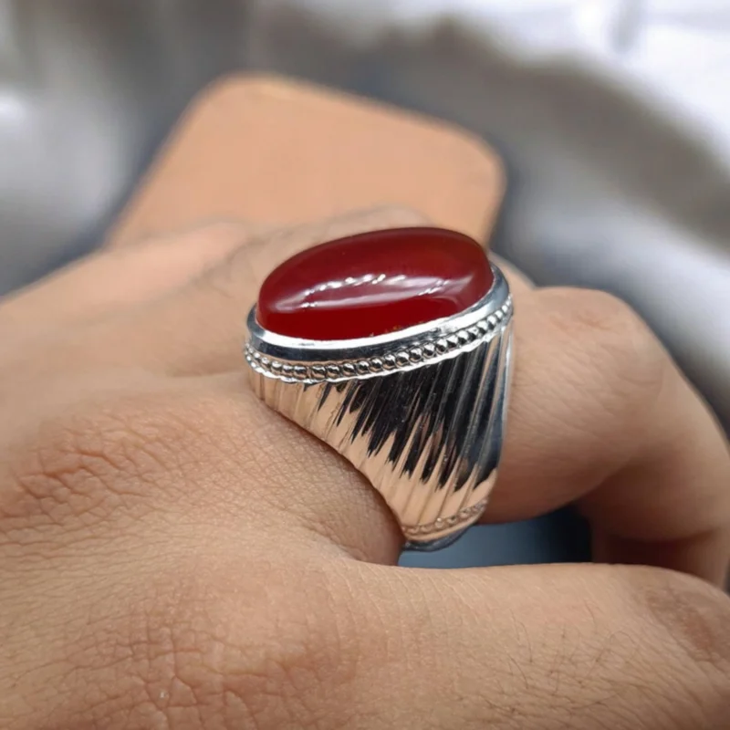 This exquisite piece features a genuine Yemeni Aqeeq stone, renowned for its rich color and cultural significance. The smooth sterling silver band complements the stone beautifully, creating a ring of undeniable sophistication.