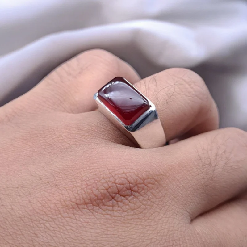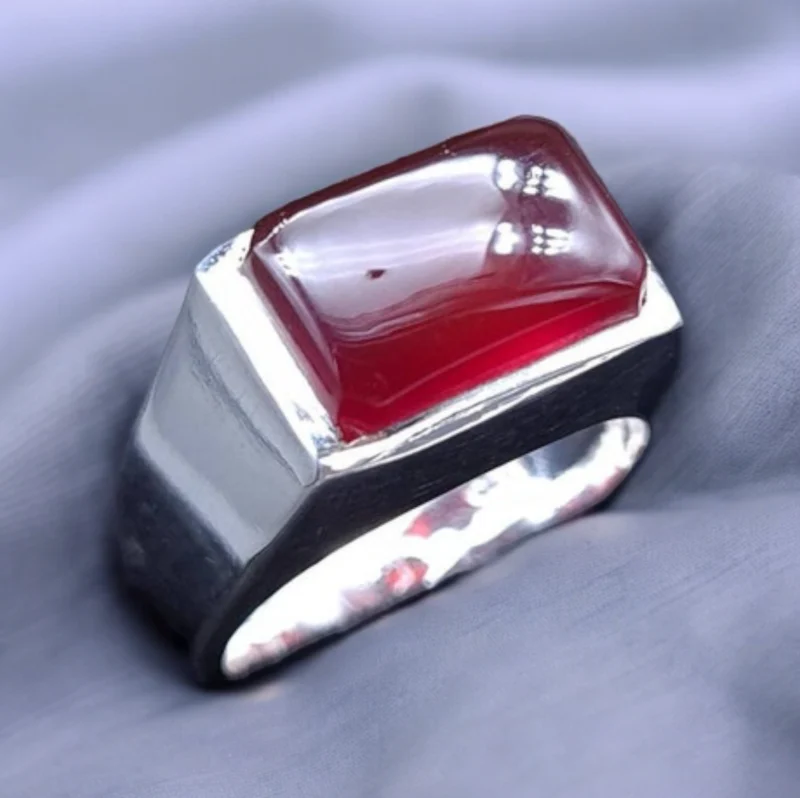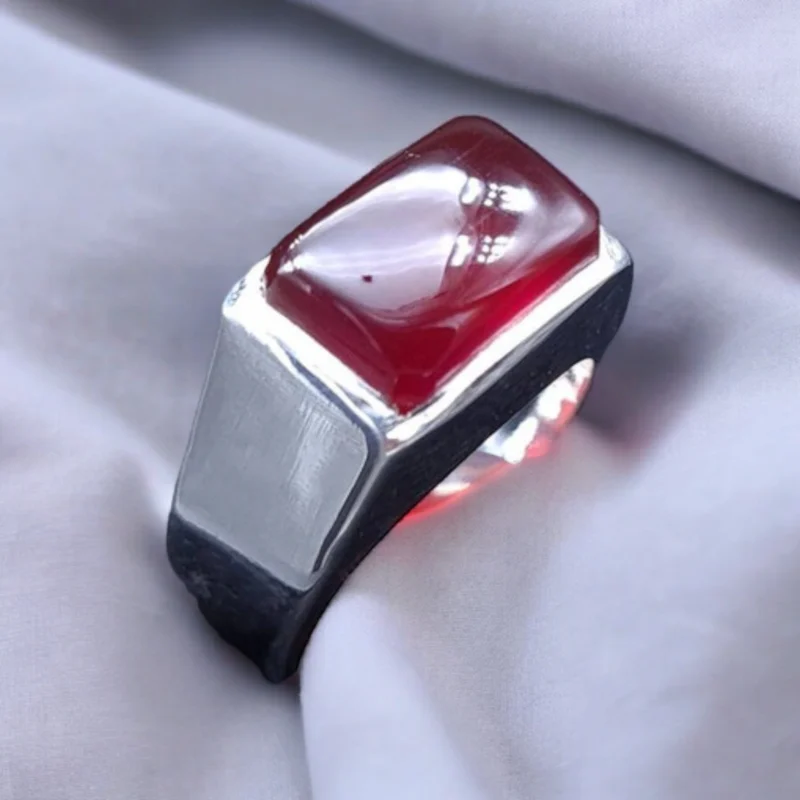 This exquisite piece features a genuine Yemeni Aqeeq stone, renowned for its rich color and cultural significance. The smooth sterling silver band complements the stone beautifully, creating a ring of undeniable sophistication.